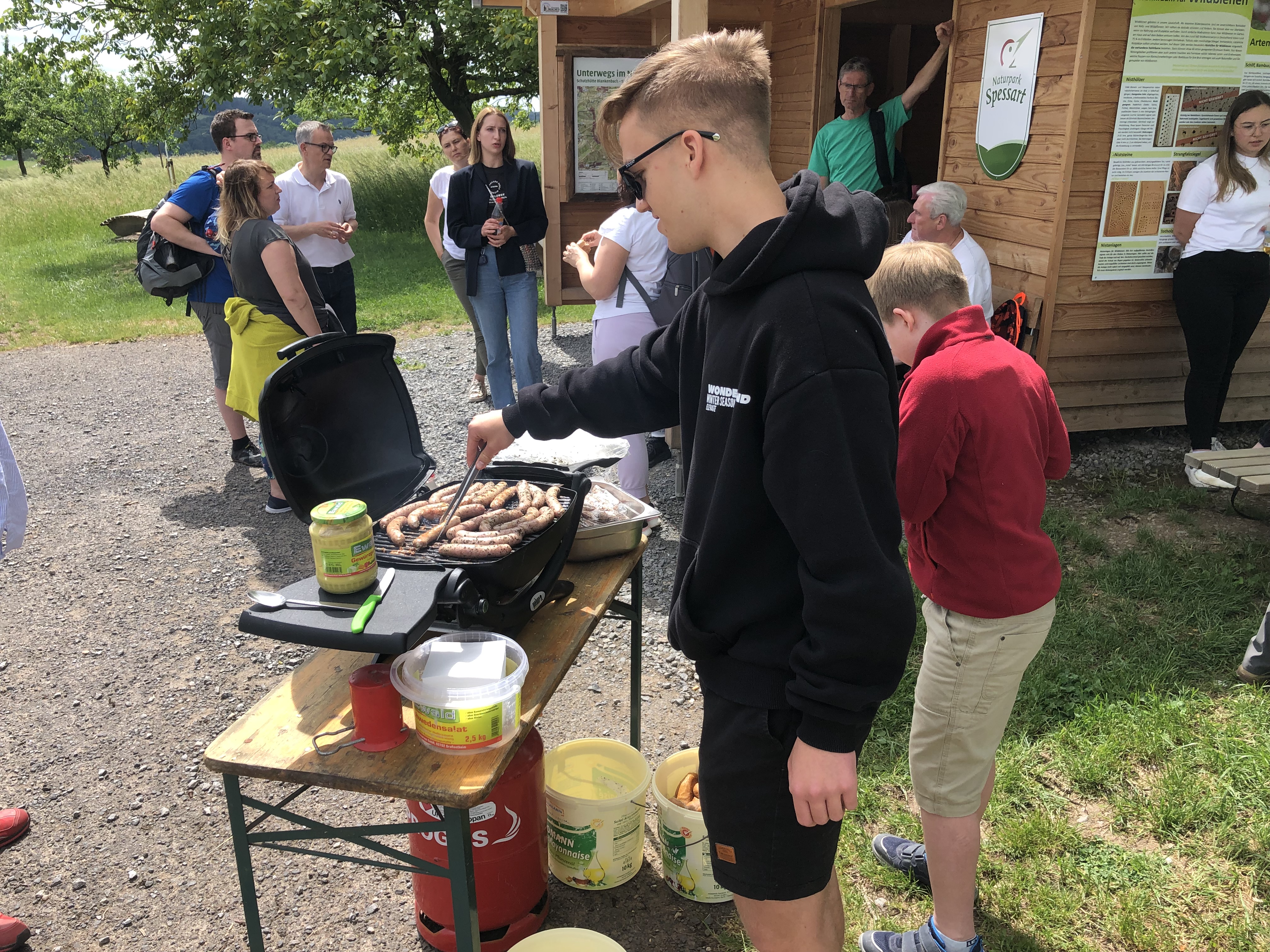 Die Anreise erfolgte standesgemäß und umweltfreundlich mit der Kahlgrundbahn. Nach einem Spaziergang zum clubeigenen Kartoffelacker wartete dort schon der Bratwurstgrill. Er versetzte die kleine Gruppe in die Lage, auch die zweite Etappe problemlos zu bewältigen. Auf dem Berghof der Familie Schudt wurde festgestellt, dass die Ziegen dort in derselben Sprache meckern wie in der Ukraine.