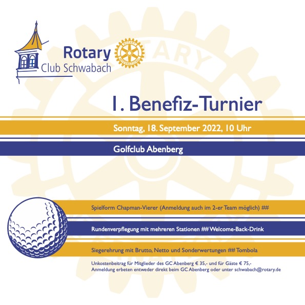 Als noch junger Club im Distrikt 1950 veranstaltet der Rotary Club Schwabach am 18.09.2022 im Golfclub Abenberg sein erstes Benefiz-Golfturnier.