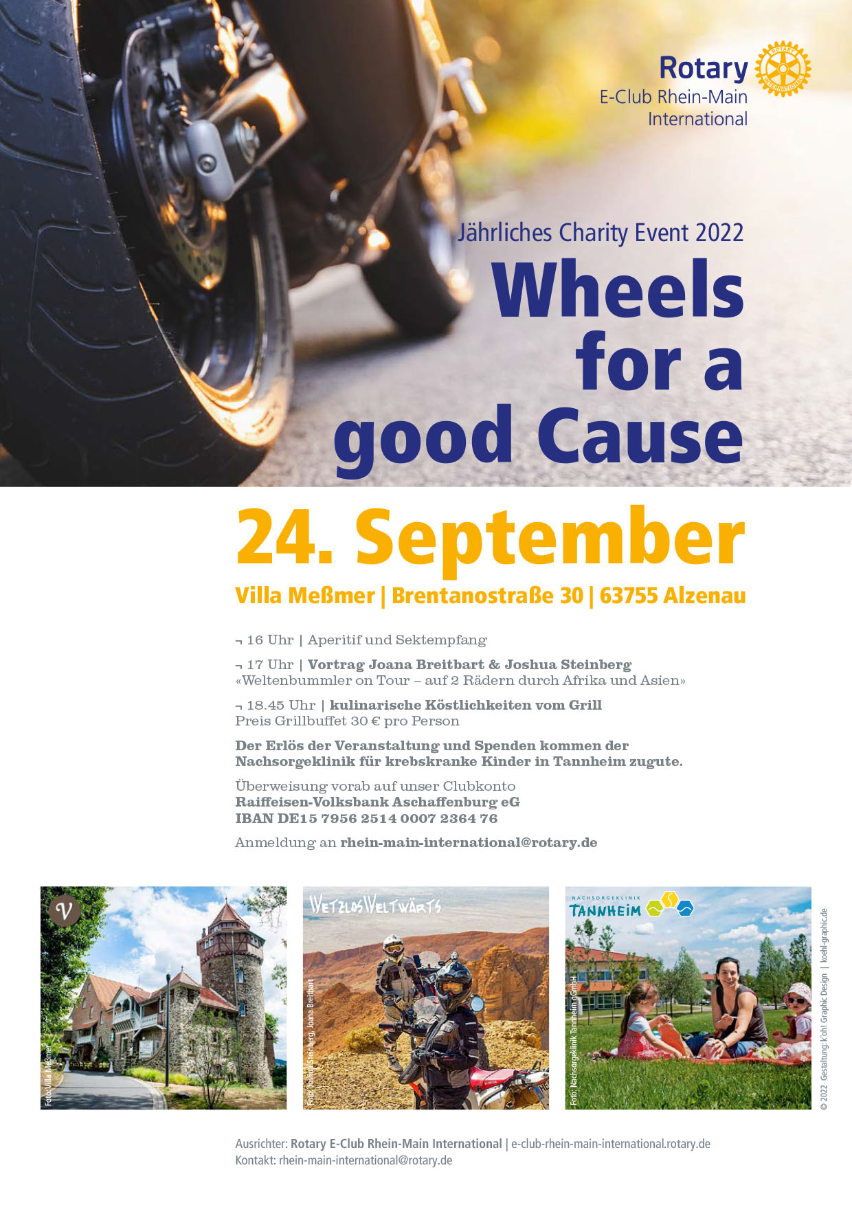 Unter dem traditionellen Motto "Wheels for a good Cause" bietet der Rotary E-Club Rhein-Main International dieses Jahr ein Charity Event an, welches vor allem die Herzen von Motorrad- und Reise-Enthusiasten höher schlagen lässt: die zwei Weltenbummler Joana Breitbart und Joshua Steinberg, die monatelang mit ihren Motorrädern durch Afrika und Asien getourt sind, werden am 24.09.2022 in der Villa Meßmer in Alzenau von ihren spektakulären Erlebnissen und einmaligen Erfahrungen berichten und so die Zuhörer zumindest für den Abend auf dieses ganz besondere Reise mitnehmen.