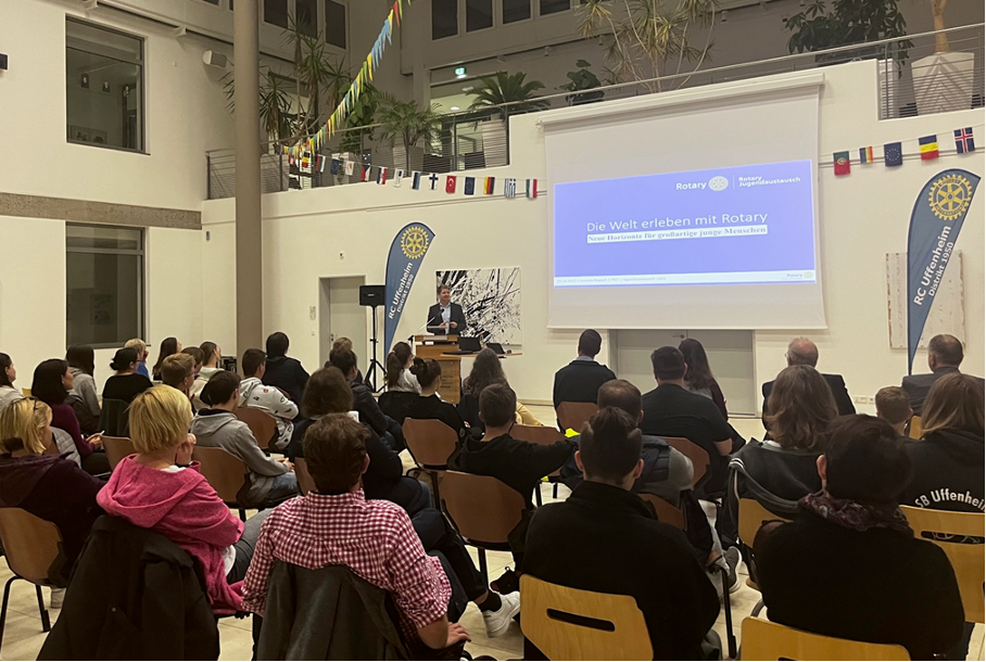 OStD Lockl forderte die anwesenden Schülerinnen auf, die Chance auf einen Austausch wahrzunehmen. Er selbst erinnere sich an die wenigsten Unterrichtsstunden, aber an viele wunderbare Reisen und bleibende Reiseeindrücke. Eine stattliche Zahl an interessierten Schülerinnen und Schülern hatte sich mit ihren Eltern eingefunden, um sich über die Möglichkeiten des Schüleraustauschs über Rotary zu informieren. Daniela Rupsch, die Jugenddienstbeauftragte des RC Uffenheim stellte das umfangreiche Programm Rotarys vor. Dieses ist das größte Non-Profit-Programm, an dem im Jahr 2019 weltweit über 8000 Jugendliche teilnahmen. Allerdings darf nicht erwartet werden, dass man eine Sprachreise oder eine touristische Unternehmung macht. Man kann zwar Wunschländer angeben, wobei vorab nicht sicher ist, ob dieser Wunsch erfüllt werden wird. Teilnehmer an diesem Austauschprogramm sind Botschafter ihres Landes und tauchen tief in die jeweilige Landeskultur ein. Grundsätzlich ist ein Schüleraustausch über Rotary wesentlich günstiger als über kommerzielle Organisationen, da die Gasteltern keinerlei Zuwendungen erhalten und der Austausch ehrenamtlich organisiert ist, es entstehen lediglich die Kosten für Flug und Versicherungen. Die Betreuung vor Ort erfolgt über den örtlichen Rotary Club, der ein genormtes Zertifizierungsprogramm durchlaufen hat. So ist eine gleichbleibend und hohe Sicherheit und Qualität weltweit gewährleistet. Unterschieden wird zwischen einem Langzeitaustausch, ein Schuljahr, und einem Kurzzeitaustausch, vier bis sechs Wochen Dauer. Möglich sind auch Sommer-Camps, die unter einem bestimmten Motto, von sportlichen Aktivitäten bis hin zu sozialen und um- weltorientierten Unternehmungen, stehen.
