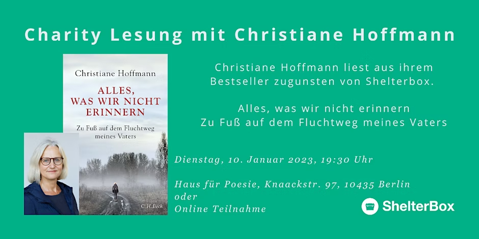Weitere Infos und Anmeldung: https://www.eventbrite.de/e/charity-lesung-mit-christiane-hoffmann-fur-shelterbox-tickets-473209671867