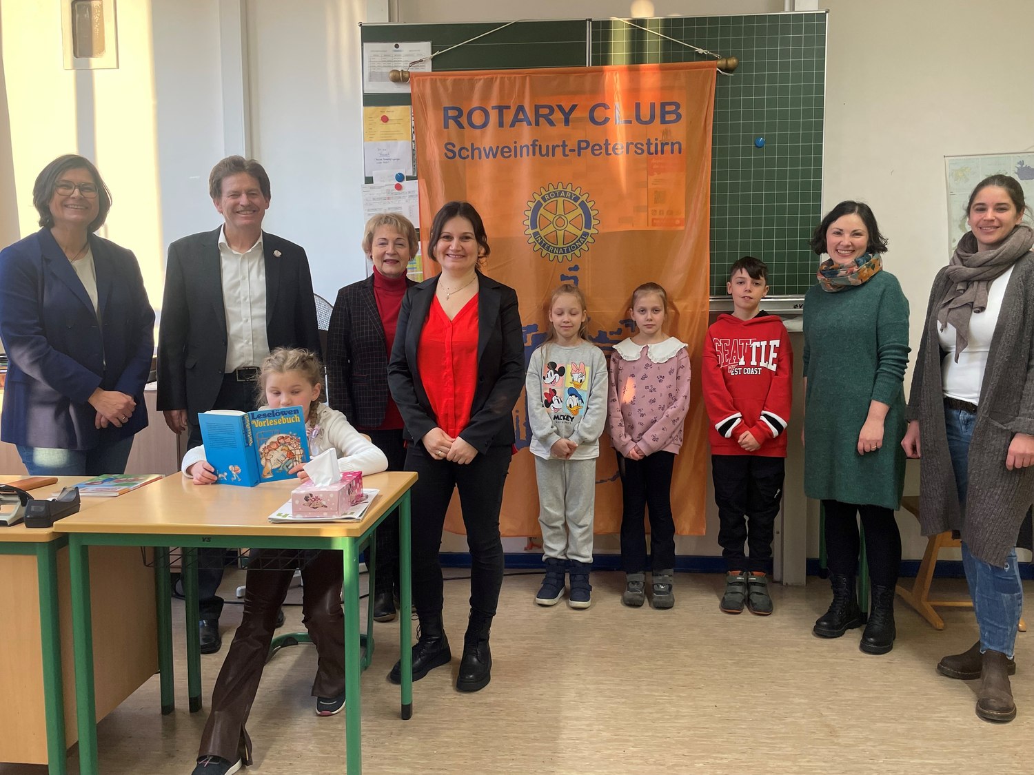 Mit einer kleinen Feier bedankten sich ukrainische Kinder der Hugo von Trimberg Schule Niederwerrn beim Rotary Club Schweinfurt-Peterstirn. Für das Schulteam und die Vertreter des Rotary Club Schweinfurt-Peterstirn, Präsident Kurt Krause sowie Vizepräsidentin Petra Weingart, hatten die Kinder mit ihren Müttern Kuchen gebacken. Der Rotary Club Schweinfurt-Peterstirn unterstützt bereits seit Frühjahr letzten Jahres die Willkommenskurse an sechs Schulen im Landkreis Schweinfurt - bisher mit 7.000 €. Auch wenn mittlerweile weniger Schüler/innen diese intensive Förderung brauchen, besteht nach wie vor Bedarf. Die Maßnahme wird daher an den Grundschulen in Niederwerrn und Poppenhausen weitergeführt.