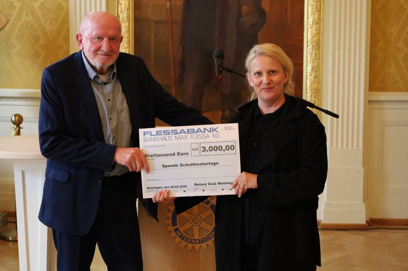 Mit großer Freude übergab Präsident Michael Bruns der Leiterin der Schultheatertage, Frau Gabriele Gillert, einen Scheck über 3.000 € als finanzielle Unterstützung. Die Schultheatertage beginnen in Kürze und bieten Schülern aus Meiningen und Umgebung die Möglichkeit, die Theaterwelt hautnah zu erleben.