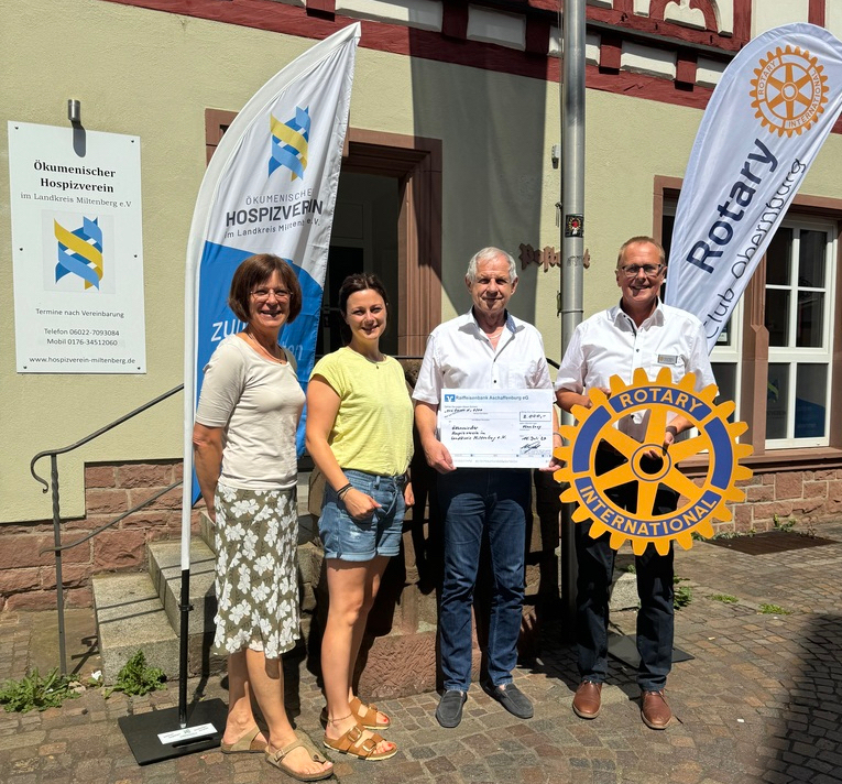 Für den 16.7.24 konnte ein gemeinsamer Termin gefunden werden. So trafen sich in der Römerstraße 51 in Obernburg Frau Wittmayer, Frau Berberich und Herr Dominig vom „Ökumenischen Hospizverein“ sowie Frau Hartmann vom „Kinder- u. Jugendhospizdienst“ Miltenberg mit Klaus Giegerich vom RC Obernburg. Für den, mittlerweile Pastpräsidenten war es eine Freude und schöne Aufgabe, jedem Verein eine Spende in Höhe von je 2000 € übergeben zu können. Damit möchten wir nicht nur unterstützen, sondern auch unsere Wertschätzung für die Arbeit beider Vereine zum Ausdruck bringen, so Klaus Giegerich.