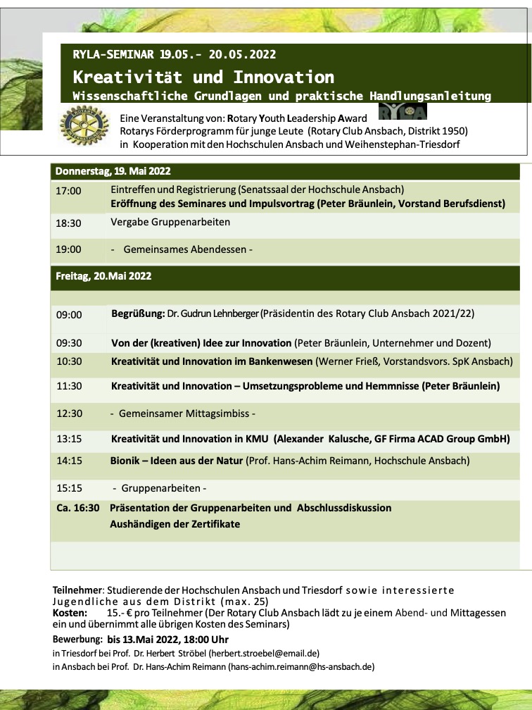 Der Rotary Club Ansbach veranstaltet in Kooperation mit den Hochschulen Ansbach und Weihenstephan-Triesdorf vom 19.05. - 20.05.2022 ein RYLA Seminar zum Thema "Kreativität und Innovation: Wissenschaftliche Grundlagen und praktische Handlungsanleitung".