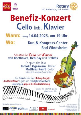 Der Rotary Club Rothenburg o.d. Tauber lädt herzlich ein am 14.04.2023 zu einem Benefizkonzert unter dem Motto "Cello liebt Klavier".Tickets im Vorverkauf erhältlich in der Touristinfo Bad...