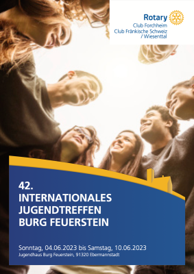 Von Sonntag, 04.06. bis Samstag, 10.06.2023 findet das 42. Internationale Jugendtreffen, organisiert von den Rotary Clubs Forchheim und Fränkische Schweiz-Wiesenttal, statt.