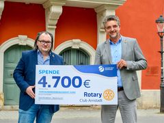 Einen Scheck von 4.700 € hat der Präsident des Rotary Clubs Arnstadt, Christian Ortloff, Bürgermeister Frank Spilling übergeben.